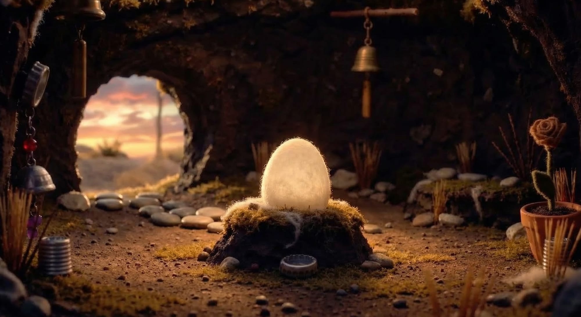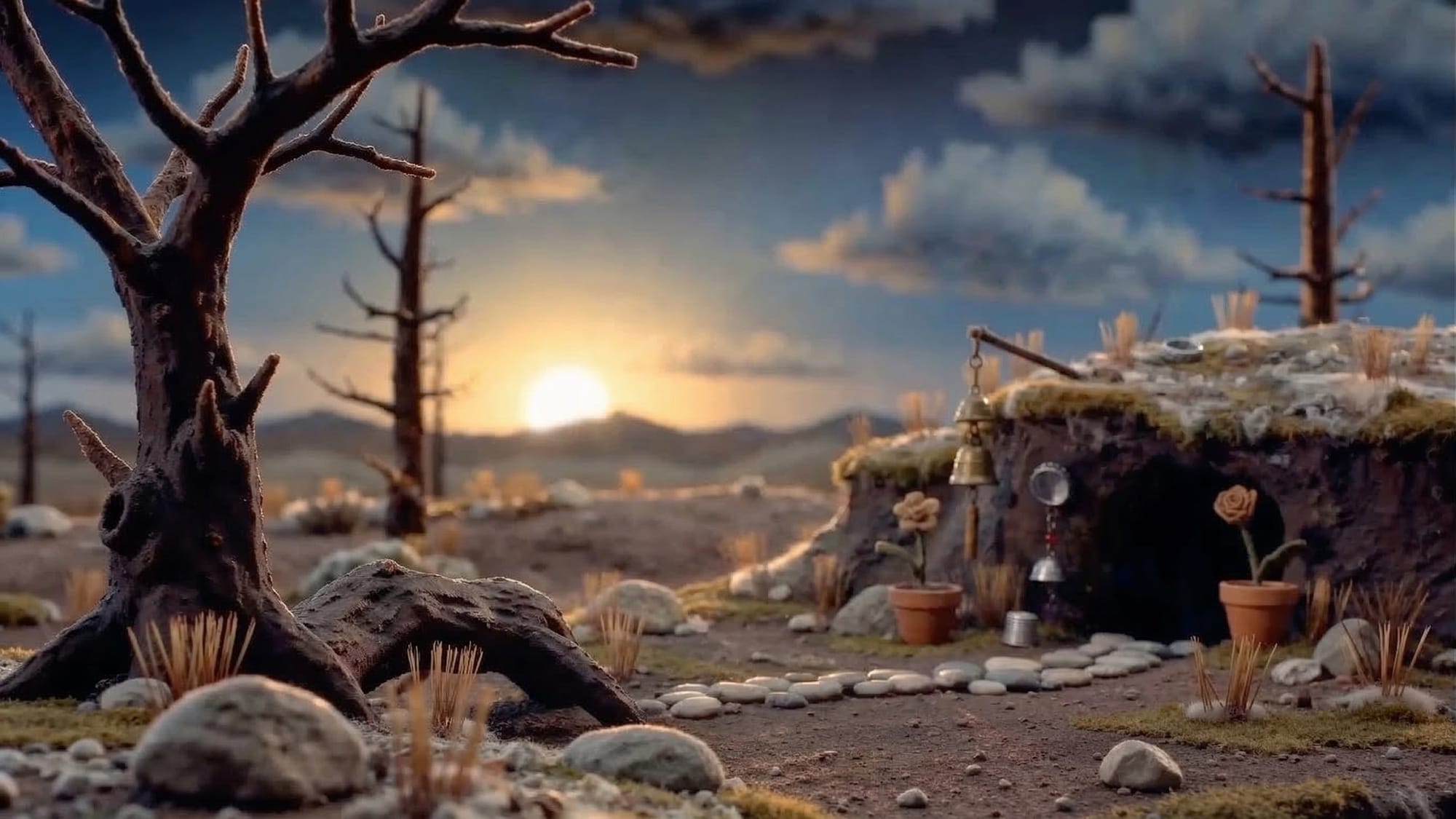 Living in a small corner of a vast desert, the story of Harold, Luce and Harley takes place in burrow dug into a mound of dry earth, decorated with things the world discarded. Inside, warm packed earth walls, found-object furniture, a shaft of daylight, a home built from scraps by creatures who don't know they're small.