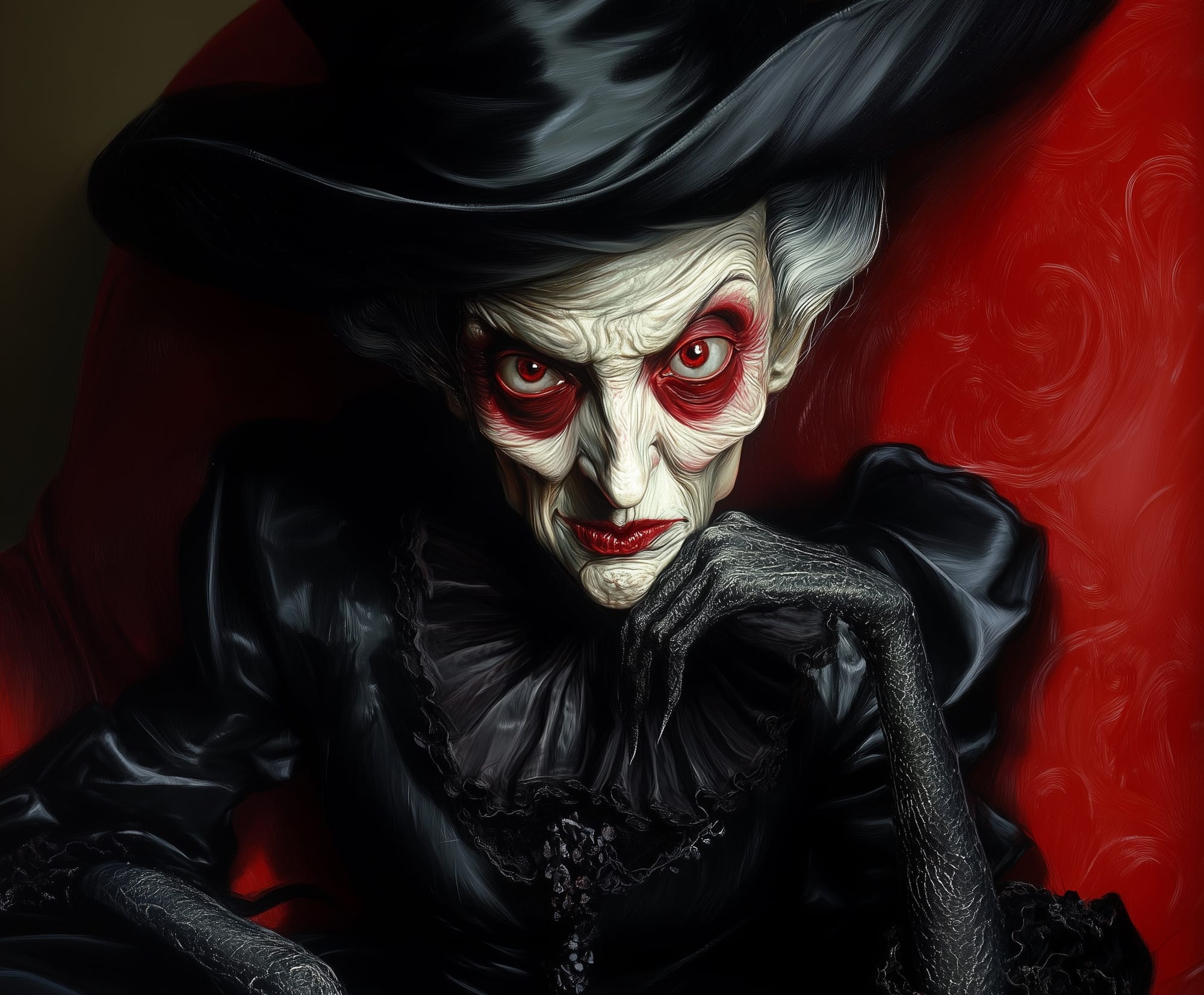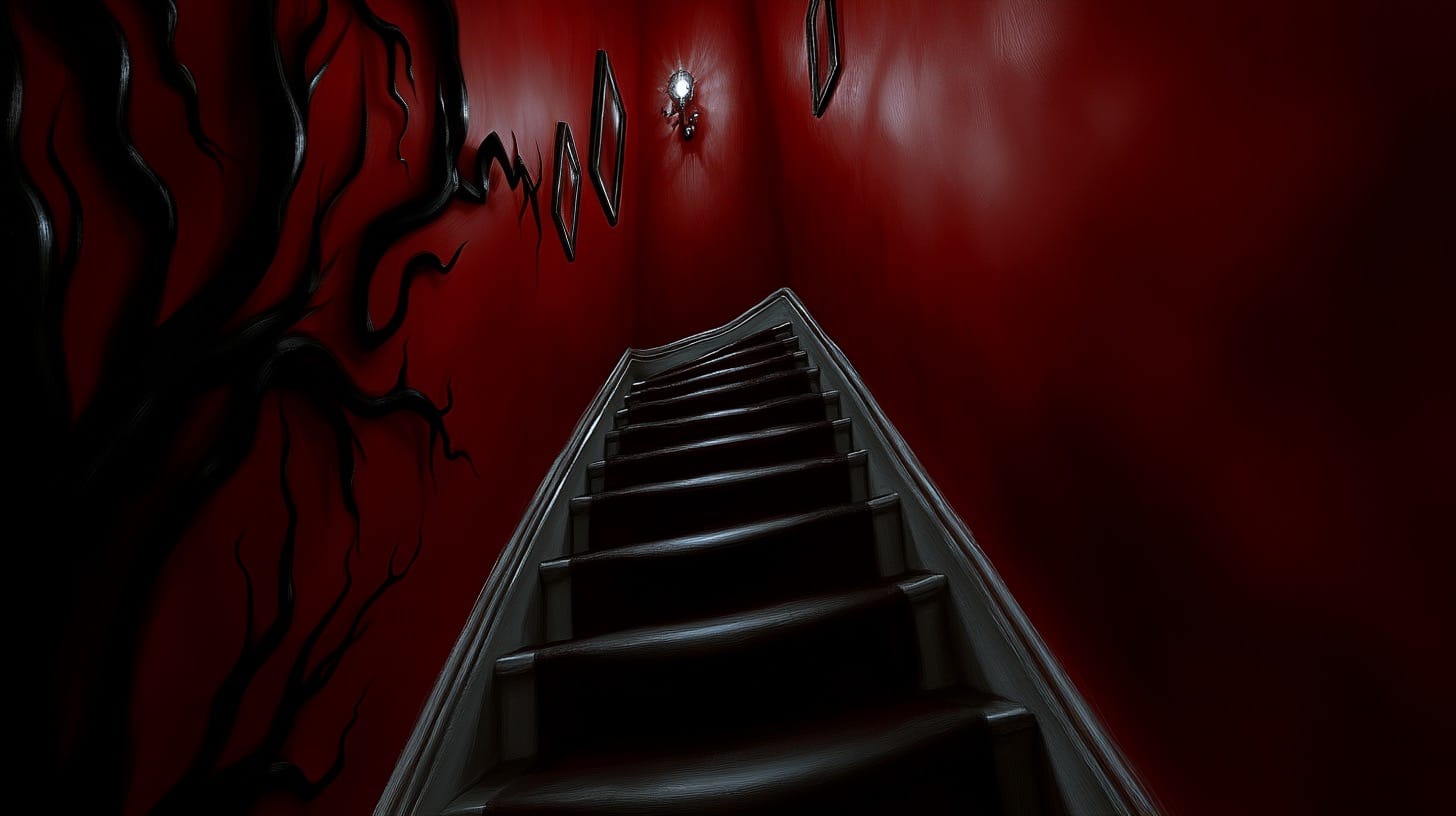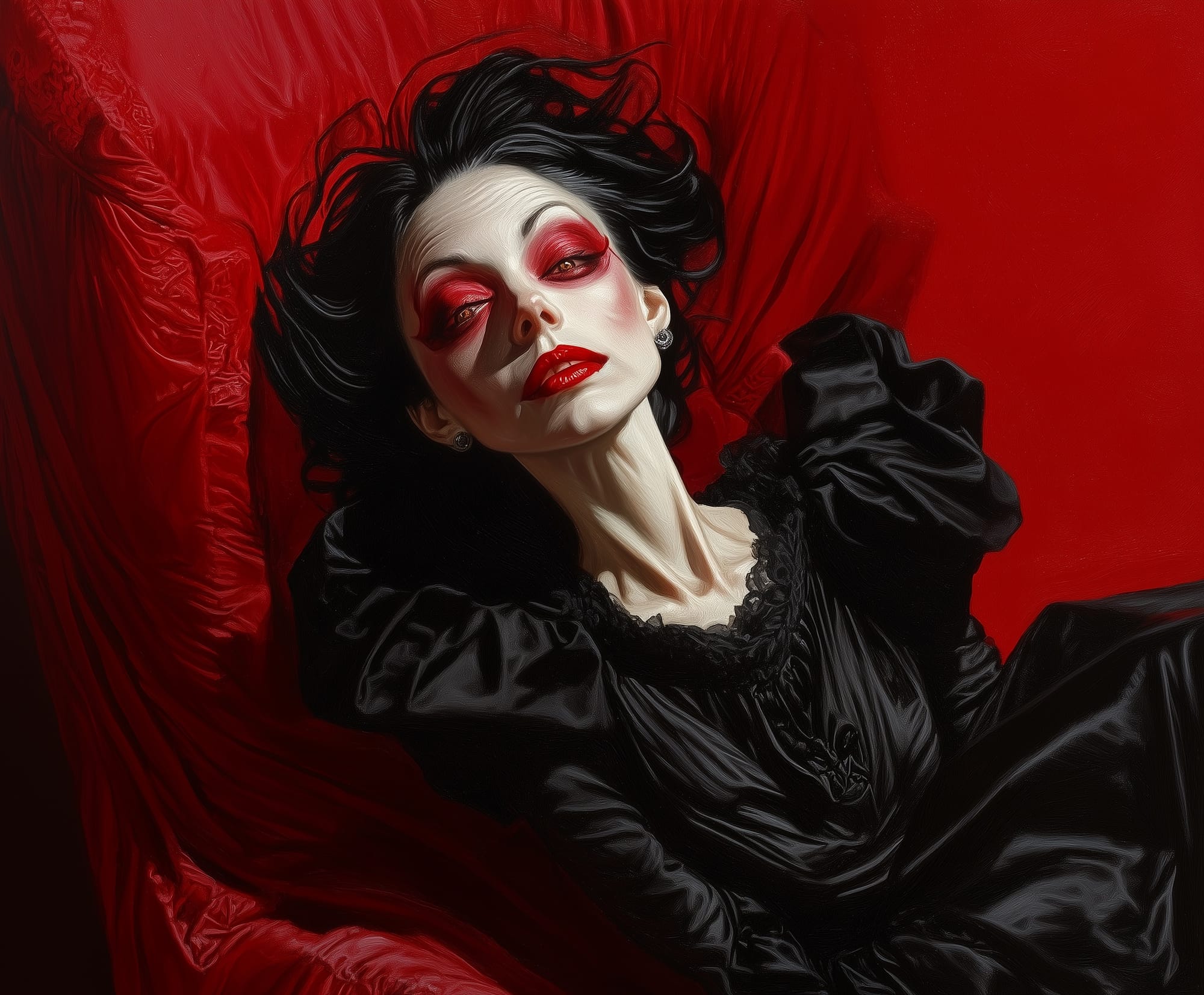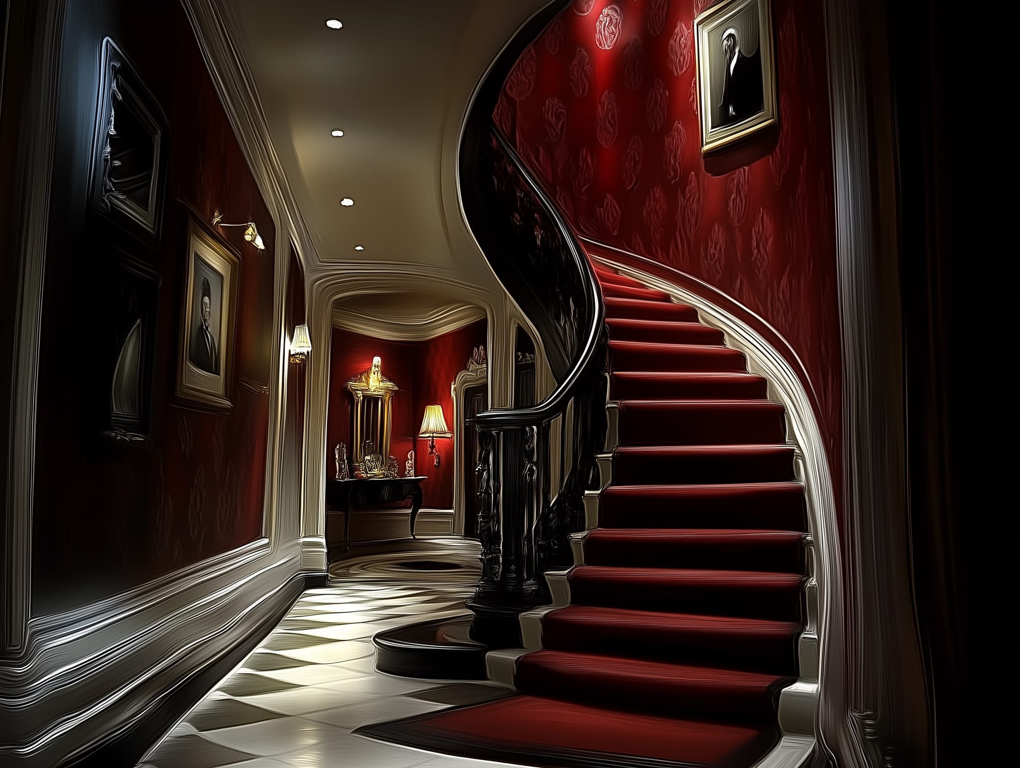 The Van Vamp mansion exists in a Hollywood that never quite left its golden age. Crimson walls absorb secrets while black-and-white checkered floors create visual rhythms that disorient and mesmerize. Time moves differently here.